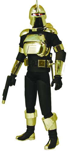 The Classic Battlestar Galactica: 12" Gold Cylon Centurion Commander Figure is a fully articulated figure equipped with chrome parts, sword, blaster and rifle; the Gold Cylon Centurion is accompanied by a new classic-styled Battlestar Galactica design. Serving as a counterpart to a Colonel Military commander, the Command CenturionĂ¢?TMs gold chassis differentiates him from a standard Centurion. Long ago the robotic Cylons rebelled against their creators, the reptilian Cylons, the latter of which were eradicated in the course of the uprising. Rulership of the Cylons was supplemented with a robotic version of the previous reptilian Imperious Leader. Driven by the command of the Imperious Leader, Cylons are brutal, pitiless, stalwart warriors largely unburdened by individual thought. Command Centurions are assigned to outposts and are charged with the command of Cylon Basestars.